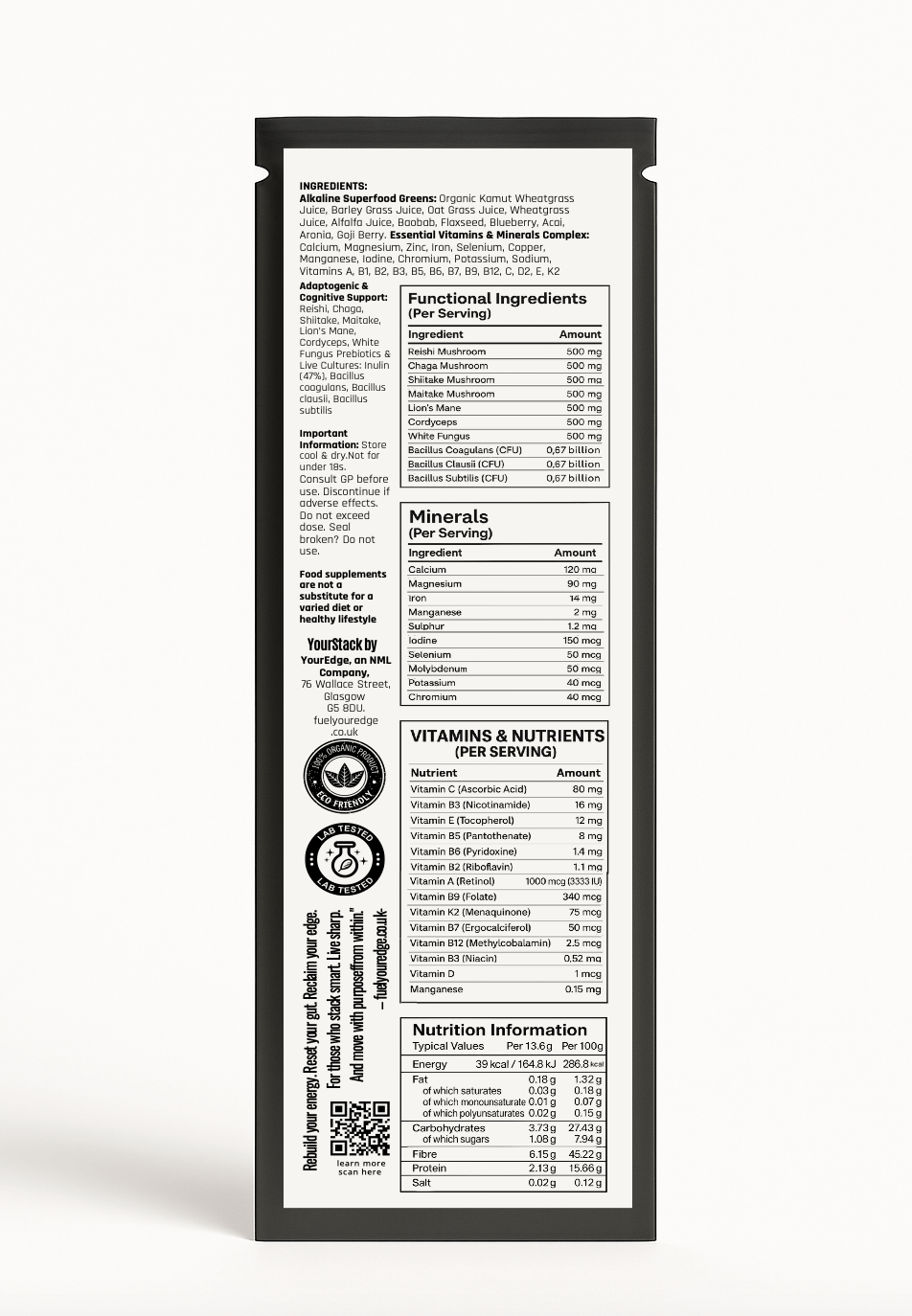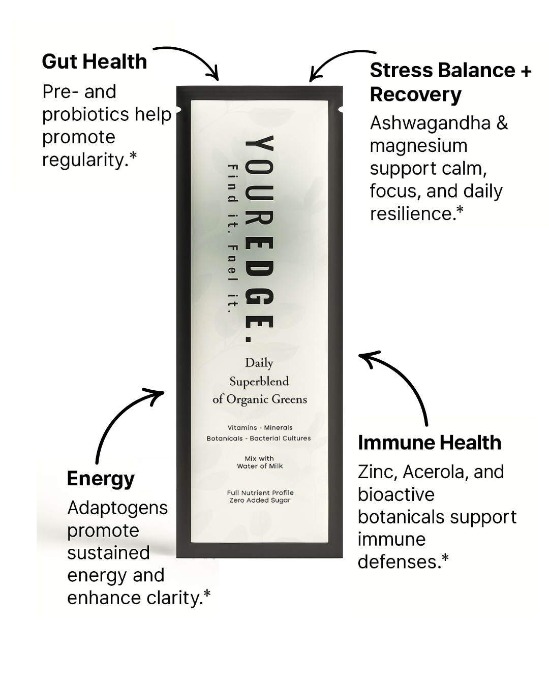 Each single-serve sachet delivers the full power of our Daily Superblend consisting of Greens + Vitamins + Minerals + Bacterial Cultures formula with zero compromise on potency or purity.